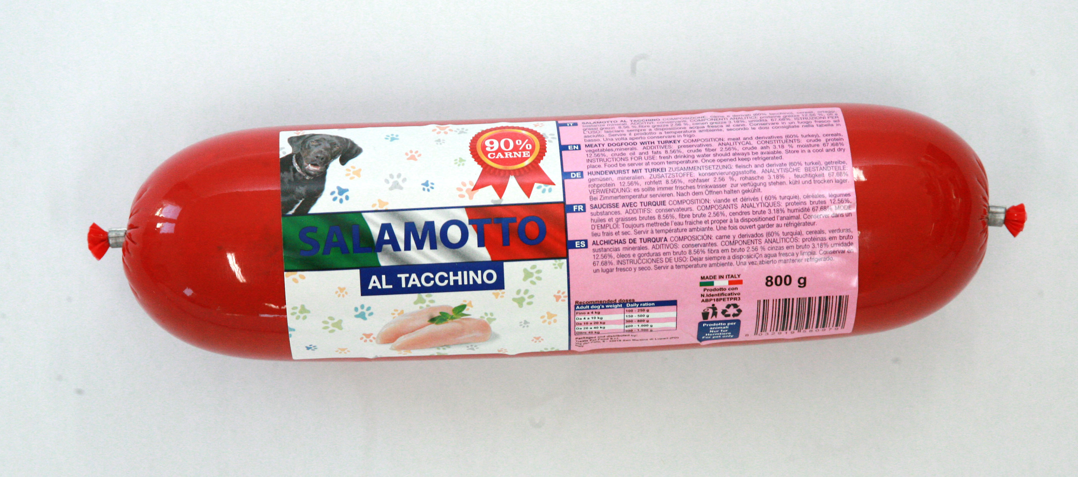 Carne e derivati 90% (40%TACCHINO), Ortaggi (patate, carote, zucchine).
